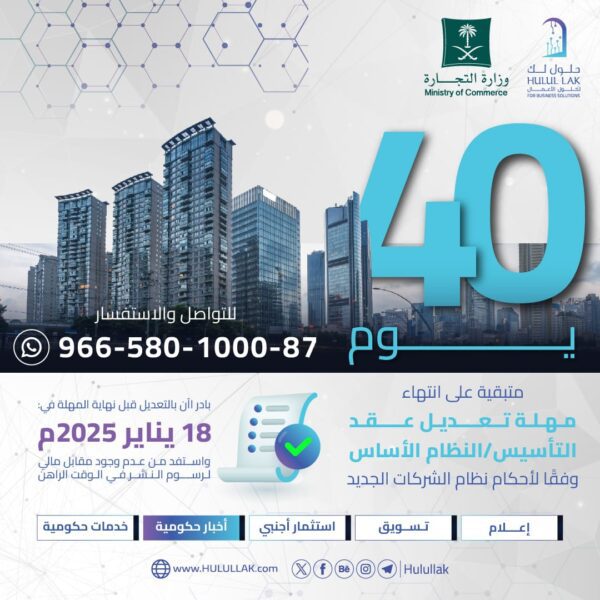 تصميم 40 يوم مهلة تعديل عقد التأسيسHulullak.team@gmail.comأبريل 11, 2025 تصميم 40 يوم مهلة تعديل عقد التأسيس الهدفإبراز قدرة حلول لك ... قراءة المزيد