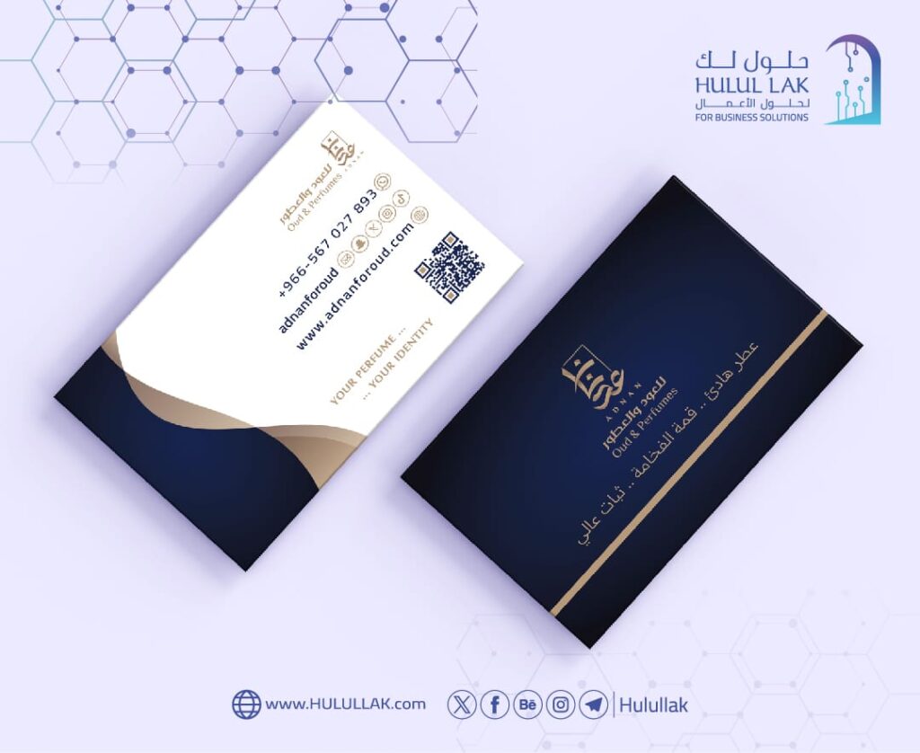 إنتاج بطاقة تعريفية احترافية تُجسّد هوية عدنان للعود والعطور بأسلوب بصري فاخر، وتدعم حضور العلامة التجارية في قطاع العطور عبر تصميم يعكس الجودة والموثوقية والفخامة، مع تعزيز سهولة الوصول للعملاء عبر حلول رقمية حديثة.