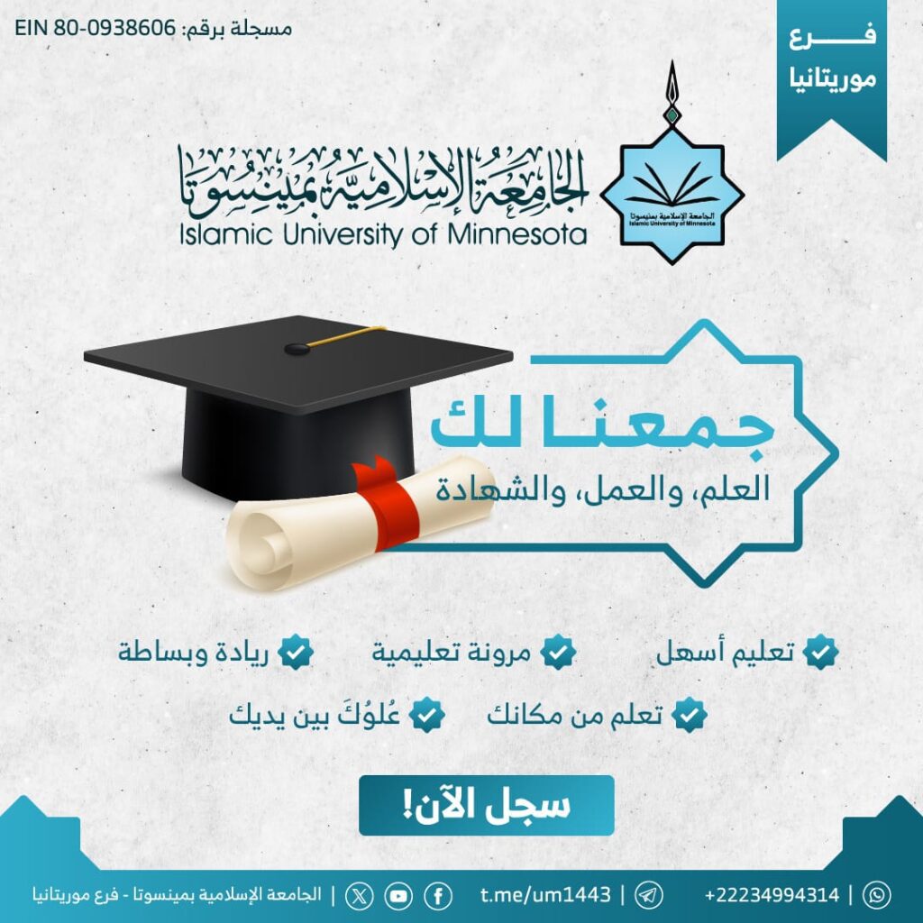 التصميم يعتمد على هوية الجامعة الإسلامية بمنيسوتا، بمزيج بصري يجمع بين الألوان الهادئة والرموز الدالة على النجاح الأكاديمي. يقدّم الرسالة بشكل مبسّط وواضح من خلال أيقونات تعليمية مباشرة وخط عربي أنيق يعكس الأصالة. التركيز كان على إبراز سهولة التعليم، مرونته، وإمكانية التعلم من أي مكان، مع تعزيز دعوة التسجيل بوضوح ضمن الهوية البصرية الرسمية للجامعة.