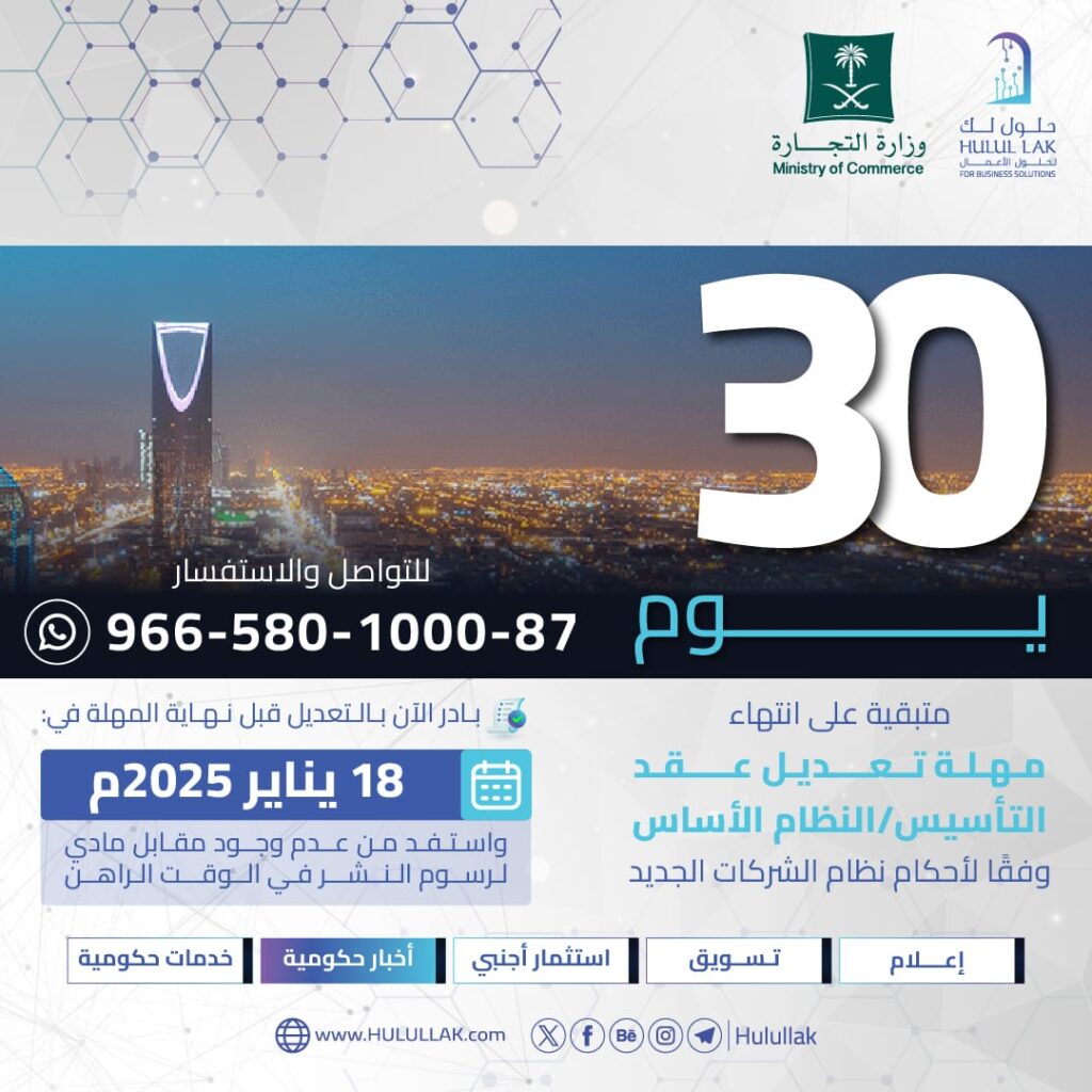 إيصال معلومة رسمية بطريقة بصرية جذابة تعكس احترافية “حلول لك”، وتعزز وضوح الرسالة الخاصة بمهلة تعديل عقد التأسيس وفق النظام الجديد.